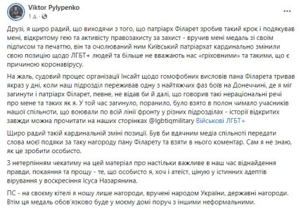 "Святейший Патриарх Филарет и Украинская Православная Церковь Киевского Патриархата, основываясь на основах Священного Писания, тысячелетнего учения Православной Церкви, неизменно занимает принципиальную негативную позицию по отношению к содомскому греху, осуждает пропаганду т.н. "однополых браков". Гомосексуальные половые связи являются ложным искажением Богоданной природы человека. Как говорится в Библии, Сам Господь за грехи людей уничтожил Содом и Гоморру. Патриарх неоднократно об этом заявлял публично и в судебном порядке доказал законность такого своего права… Ввиду открытой пропаганды греховной идеологии и отрицания существования Бога, считать церковную награду Виктору Пилипенко от 08.02.2024 г. указ № 27468 – аннулированной", — говорится в сообщении.