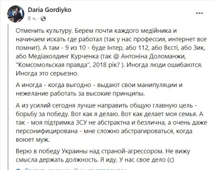 Вместе с тем экс-сотрудница Медведчука добавил, что к ней была применена Cancel culture (культура отмены — ред.). По словам Гордийко, 9 из 10 сотрудников масс-медиа работали в пророссийских СМИ в том числе и Антонина Доломанджи (2018 год, "Комсомольская правда").