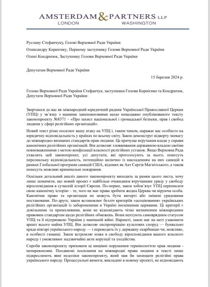 Народные депутаты получили письмо с угрозами от американской адвокатской конторы Amsterdam & Partners LLP. Она представляет интересы УПЦ МП и финансируется экс-нардепом и бизнесменом Вадимом Новинским.