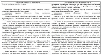 Следует отметить, что документом предусматривается внесение изменений в закон Украины "О воинской обязанности и военной службе". В частности, в пункте 12 предлагается указать, что женщин, состоящих на военном учете, могут призвать на службу или привлечь к работам по обеспечению обороны государства в военное время в добровольном порядке. В то же время в мирное время женщины могут быть приняты на военную службу и службу в военном резерве только в добровольном порядке (по контракту).
