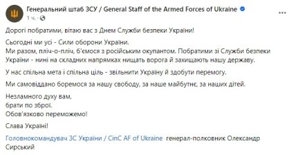 "Сегодня мы все – Силы обороны Украины. Мы вместе, бок о бок, сражаемся с русским оккупантом. Побратимы из Службы безопасности Украины — сейчас на сложных направлениях уничтожают врага и защищают наше государство. У нас общая цель и общая цель – освободить Украину и одержать победу. Мы самоотверженно боремся за нашу свободу, за наше будущее, за наших детей. Несокрушимого духа вам, братья по оружию. Обязательно победим!", — пишет главком.