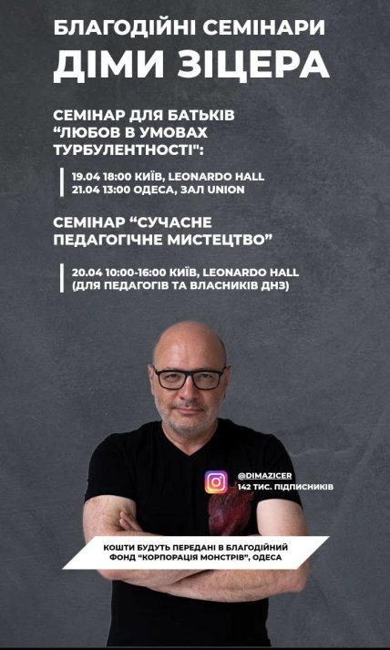 В Киеве и Одессе 19 и 21 апреля 2024 года российский педагог и гражданин Израиля Дима Зицер проведет благотворительные семинары для родителей на тему "Любовь в условиях турбулентности". Собранные от этих мероприятий средства он планирует направить одесскому фонду "Корпорация монстров".