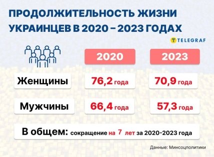 Как подсчитали демографы, столь резкое ухудшение произошло с 2020 по 2023 год. С прошлых 76,2 лет продолжительности украинки теперь живут только до 70,9. У мужчин падение стало еще более поразительным: с 66,4 года 2020-го — до всего лишь 57,3 года — 2023-го.