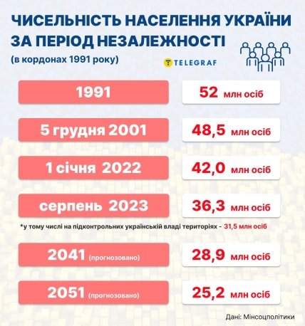 По одному из сценариев Минсоцполитики, население Украины, составившее 52 млн человек на момент обретения независимости в 1991 году, может сократиться до 25,2 млн уже в 2051 году — половины своей прежней численности.