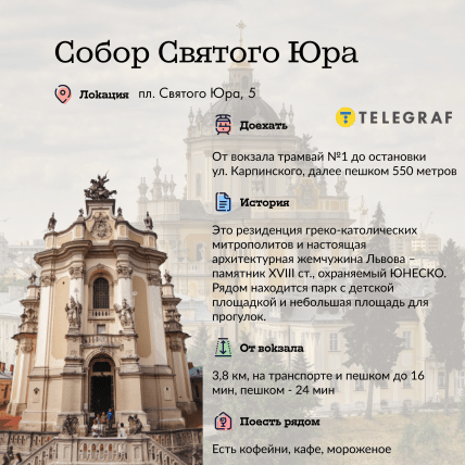 Собор Святого Юра – величественный рококовый архитектурный ансамбль XVIII века (включающий собор, колокольню, митрополичьи палаты и капитульные здания), поражающий своей архитектурой. Возле основного храма есть колокольня, построенная в 1828 году, где хранится самый древний колокол в Украине. Надпись на нем датирована 1341 годом.