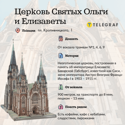 Церковь Святых Ольги и Елизаветы во Львове (бывший костел Елизаветы) — это неоготический храм, который является одним из самых высоких построек города — 88 метров. Его построили в начале XX века, вскоре после трагической гибели австрийской императрицы, жены императора Франца Иосифа — Елизаветы, известной как Сиси. Церковь называли "памятником цесарской любви".