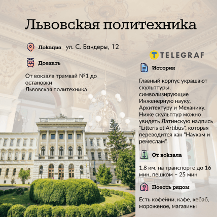 Национальный университет "Львовская политехника" – старейшее техническое учреждение высшего образования Украины и Восточной Европы. Здание главного корпуса в неоклассическом стиле построили в 1877 году. Здесь можно погрузиться в атмосферу университета XIX в. Аналогов украшения местного актового зала нет в Украине. Также в рамках экскурсии можно посетить Машинный зал с механизмами и оборудованием разных эпох, увидеть редкие документы, в частности, связанные с нобелевской лауреаткой Марией Кюри-Склодовской, подняться в одну из древнейших обсерваторий Украины. Если времени на экскурсию нет, можно прогуляться по территории вокруг главного корпуса с зелеными аллеями и небольшими фонтанами.