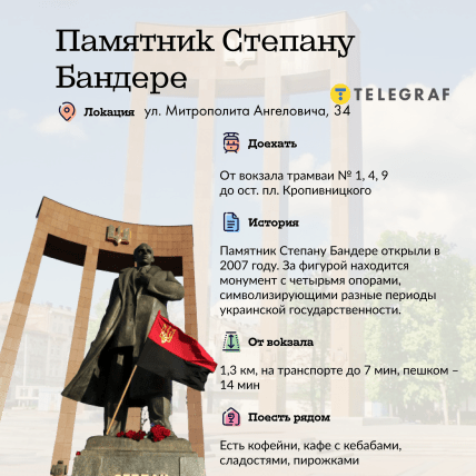 Посвящённый Степану Бандере монумент – одна из туристических изюминок района. Семиметровый памятник лидеру украинских националистов во весь рост находится через дорогу от церкви Ольги и Елизаветы. За ним находится 30-метровая триумфальная арка, которая называется Стеллой украинского государства. Комплекс был открыт в 2007 году и является одним из известнейших памятников Бандере в Украине.