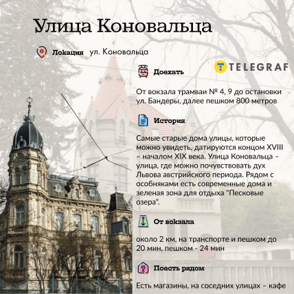 Если хочется почувствовать дух австрийского Львова, можно прогуляться по улице Коновальца и прилегающим улицам. В начале XIX века это была загородная территория с частными усадьбами, виллами и парками.