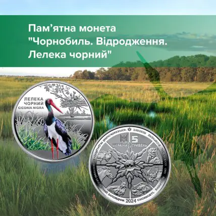 Это монета "Чернобыль. Возрождение. Аист черный", ее номинал 5 грн. Об этом сообщает пресс-служба НБУ.
