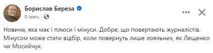 Вместе с тем, экс-нардеп Борислав Береза написал в своем Facebook, что возвращение в Раду журналистов, по его мнению, имеет свои плюсы и минусы. Объяснил, что имеет в виду.