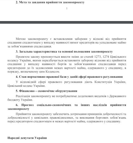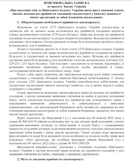 "Учитывая определенное законодательством право на отказ от принятия наследства, во избежание обращения взыскания на имущество в счет погашения долга, часто наследники отказываются от принятия уже наследуемого имущества с нарушением принципов добродетели и добросовестности в гражданских правоотношениях. Это делается для того, чтобы скрыть активы должника от взыскания отдельными кредиторами по обязательствам. Тем самым наносится ущерб кредиторам", – говорится в пояснительной записке к законопроекту.