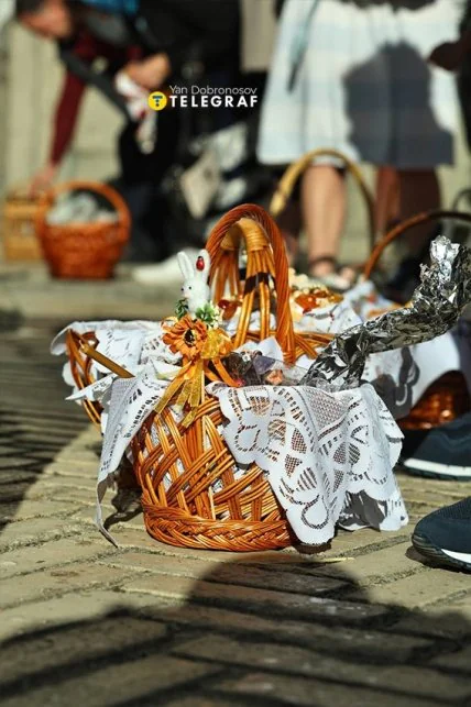 Пасхальные корзины киевлян с пасхами, пасхальными яйцами и другими угощениями выстраивали перед освящением. Священник щедро их окропил и пожелал прихожанам здоровья, благодати и светлой Пасхи.