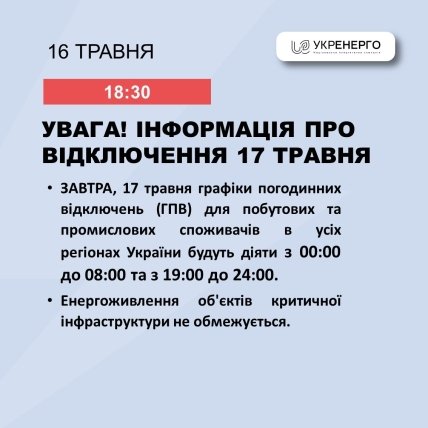 Об этом на своей странице в Facebook сообщает компания "Укрэнерго". Отмечают, что вынуждены ограничить потребление электроэнергии 17 мая с 00:00 до 08:00 и с 19:00 до 24:00.