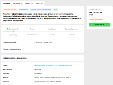 Тендер появился на портале днем 4 июня. У нем только один лот стоимостью 498 700 гривен. Идентификатор закупки — UA-2024-06-04-006287-a.