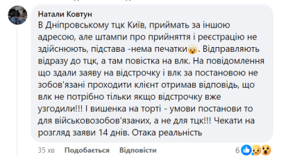"В Днепровском ТЦК Киев, принимают по другому адресу, но штампы о принятии и регистрации не осуществляют, основание — нет печати. Отправляют сразу в ТЦК, а там повестка на ВЛК. На сообщения, что подавшие заявление на отсрочку и ВЛК по постановлению не обязаны проходить, клиент получил ответ, что ВЛК не нужно, только если отсрочку уже согласовали", "Ага, вот только все равно попадешь на ВЛК, даже если в ЦНАП подаешь заявление — слова ТЦК", — пишут комментаторы.