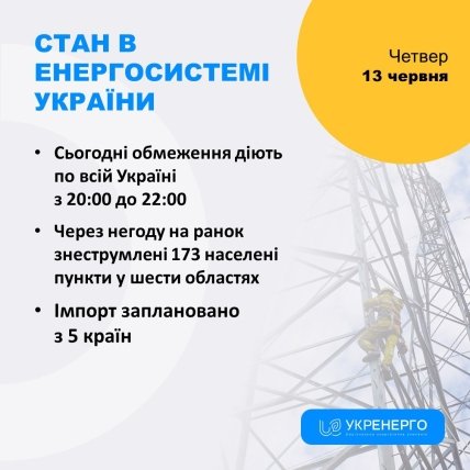 Для преодоления дефицита в энергосистеме электроэнергия импортируется из Европы. На 13 июня запланирован импорт из Румынии, Словакии, Польши, Венгрии, Молдовы. Общим объемом 27 671 МВт*ч, с максимальной мощностью в отдельные часы до 1 624 МВт.