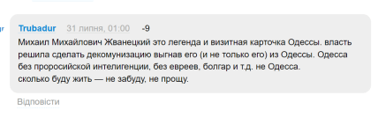 В свою очередь член исполкома в федерации шахмат Одесскойй области Михаил Голубев приравнял переименование бульвара Жванецкого к мародерству и проявлению пренебрежения культурным наследием. "Хотя вопрос переименования бульвара Жванецкого для Одессы болезненный и подозреваю, что мое мнение по этому поводу – в явном меньшинстве среди окружающих людей. "Депушкинизацию" Одессы же считаю просто отвратительным хунвейбинством. По многим причинам", – написал Михаил Голубев.