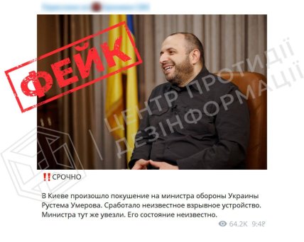 Об этом сообщает Центр противодействия дезинформации при СНБО. Отмечается, что российские пропагандисты распространяют ложную информацию о покушении на украинского министра обороны с помощью взрывного устройства.