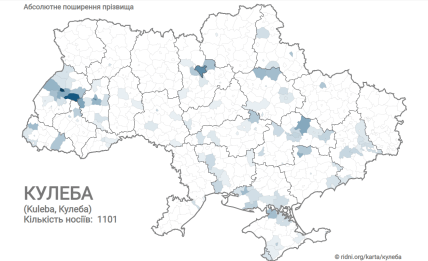 По данным сайта "Рідні", в Украине проживает 1 101 человек с фамилией "Кулеба". Больше всего — Львов (198), Тернополь (57), Киев (50). Самые распространенные личные имена людей с фамилией Кулеба — Владимир и Мария.