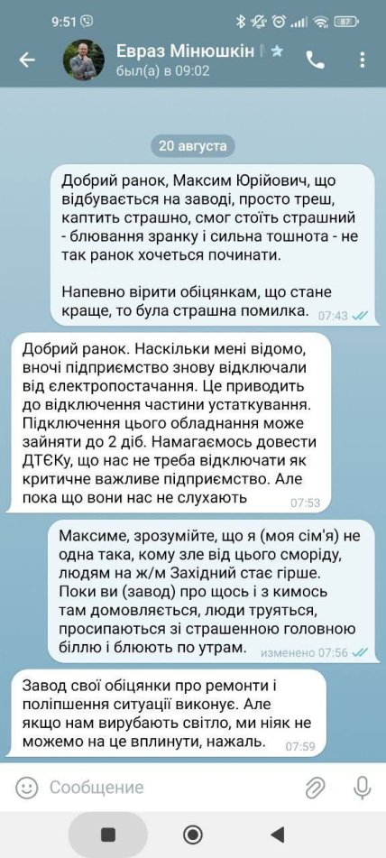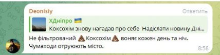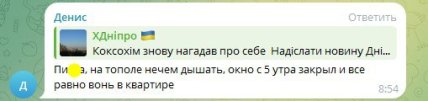 Следует заметить, что проблема с выбросами с коксохимического завода беспокоит днепрян и жителей области не первый год. В конце августа жительница Днепра получила комментарий от представителя завода. Скрин сообщения ниже.