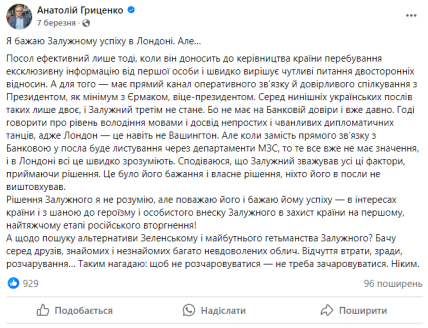 В марте 2024 года Анатолий Гриценко подверг критике Валерия Залужного и заявил, что он "не имеет на Банковом доверии и уже давно".