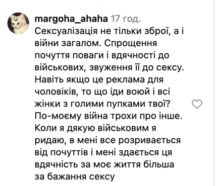 Блогерка добавляет, что реклама "Я люблю третью штурмовую" не для женщин и они здесь не главный объект. У серии есть разные визуалы, но самые хайповые: пара в гражданском и женщина с оружием, на другом военный отражается в очках, на третьем — девушка с обнаженным животом лежит на коленях у военного.