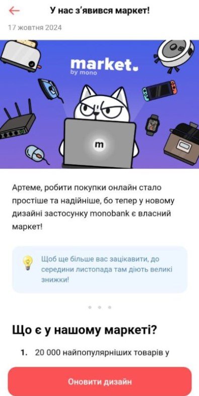 Популярный мобильный банк Monobank расширил список своих услуг. Компания официально запустила свой маркетплейс под названием "market by mono" непосредственно в приложении. Это нововведение стало доступно пользователям, которые перешли на новый дизайн приложения.