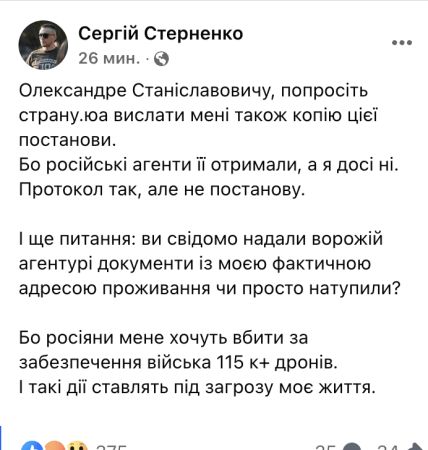 "Вы сознательно предоставили вражеской агентуре документы с моим фактическим адресом проживания или просто протупили? Потому что россияне меня хотят убить за обеспечение войска 115 к+ дронов. И такие действия ставят под угрозу мою жизнь", — говорится в сообщении.