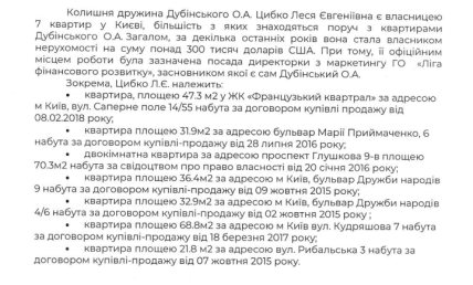 В заявлении "Центра противодействия коррупции" отметили, что Олесе Цибко принадлежало 7 квартир в Киеве, большинство которых находились рядом с квартирами самого Дубинского. Также отмечается, что за последние года Олеся Цибко стала владельцем недвижимости на общую сумму более 300 тысяч долларов. При этом ее официальное место работы была указана должности директора по маркетингу ГО "Лига финансового развития", основателем который был сам Дубинский.