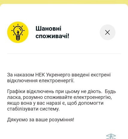 "По приказу НЭК Укрэнерго введены экстренные отключения электроэнергии. Графики отключений при этом не действуют. Пожалуйста, разумно потребляйте электроэнергию, если она у вас есть, чтобы помочь стабилизировать систему", — говорится в сообщении.