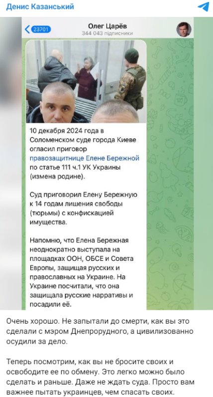 Обвинительный приговор по ч. 1 статьи 111 Уголовного кодекса Украины был объявлен еще 10 декабря. Суд приговорил Елену Бережную к 14 годам лишения свободы с конфискацией имущества.