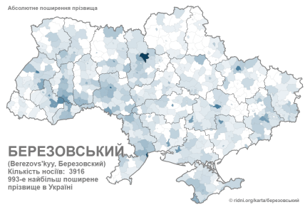 Сегодня в Украине проживает 3916 людей с этой фамилией. Чаще всего носители фамилии Березовский встречаются в Галичине, однако местами компактного проживания являются такие города, как Киев, Одесса, Винница, Днепр, Харьков.