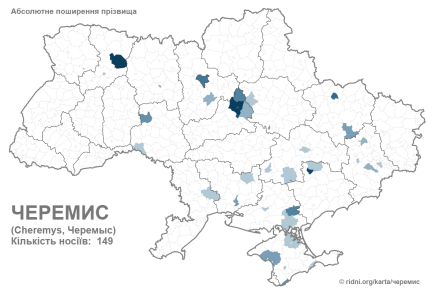 Сегодня в Украине живет 149 человек с фамилией Черемис. Эта фамилия также часто встречается на Приднепровье. Местами компактного проживания носителей данной фамилии являются Запорожье, Хотин, Золотоноша и Черкассы.