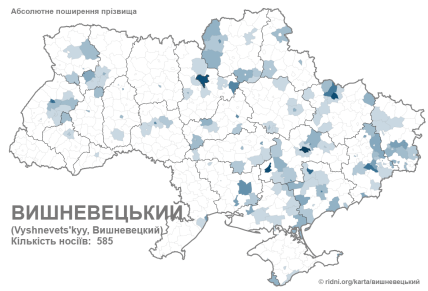 Количество носителей этой фамилии в Украине составляет 585 человек. Чаще всего эта фамилия встречается на юге, однако ее носители живут и на западе Украины. В Кременецком районе Тернопольской области расположен поселок Вишневец — оттуда берет начало род князей Вишневецких.