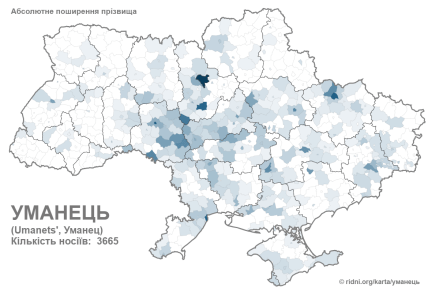 В Украине проживает 3665 человек с этой фамилией. Эта фамилия, вероятно, происходит от названия города Умань Черкасской области. Чаще она встречается на Приднепровье: носители этой фамилии компактно проживают в Киеве, Харькове, Виннице и Одессе.