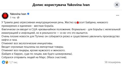 Российский и украинский журналист Иван Яковина отметил агрессивный характер речи и ее направленность против действующего президента Джо Байдена. По его наблюдениям, Трамп анонсировал масштабные изменения во внутренней политике США: от усиления миграционного контроля до отмены экологических инициатив.