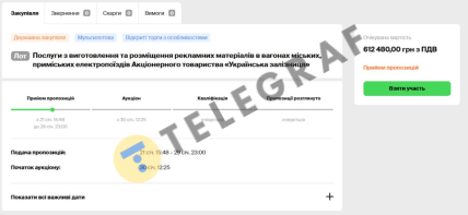 Укрпочта требует от исполнителя обеспечить ежедневную заполняемость рекламой не менее 90% носителей в городской электричке и 50% в пригородных поездах. Срок размещения материалов – до конца 2025 года. Гарантийный срок эксплуатации рекламных материалов составляет один месяц после начала размещения.