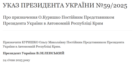 В пятницу, 24 января, Владимир Зеленский назначил на должность Постоянного представителя Президента Украины в Крыму Ольгу Куришко. Ранее она занимала пост исполняющей обязанности постпреда в АР.