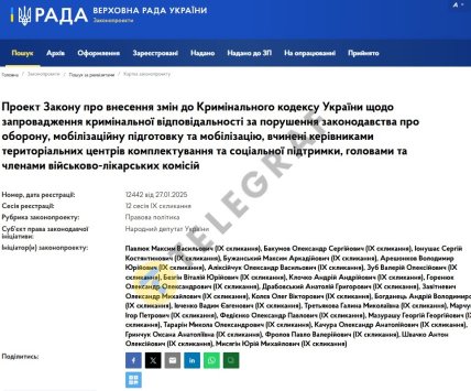 В Верховной Раде зарегистрировали новый законопроект, касаемый уголовной ответственности работников ТЦК и членов военно-врачебных комиссий за нарушения во время мобилизации. Законопроект №12442 внесен в парламент в понедельник, 27 января 2025 года.