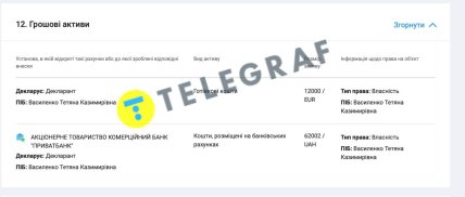 Татьяна Василенко указала, что накопила 12 тысяч евро сбережений, а также еще имеет 62 тысячи гривен на банковском счете.