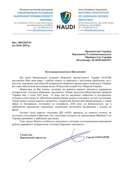 NAUDI призывает Президента Украины принять безотлагательные меры по нормализации работы "Агентства оборонных закупок" и гарантировать стабильное финансирование контрактов, ведь от этого зависит обеспечение наших воинов оружием на передовом", — добавляется в сообщении.