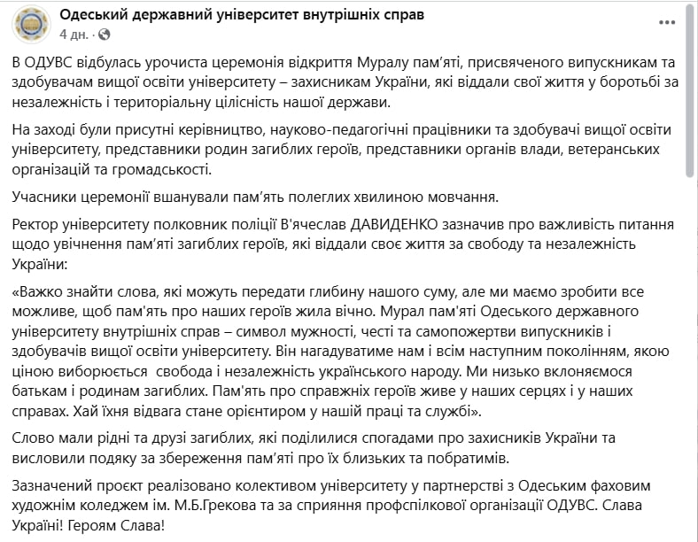 Одесский государственный университет внутренних дел разместил фото живого защитника на мемориале погибших Новость обновлена 10 февраля 2025, 10:37