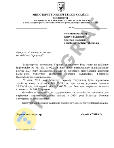 С оклада был удержан налог на доходы физических лиц в размере 26 664,39 гривны и военный сбор – 7 406,78 гривны. Об этом свидетельствуют официальные ответы Министерства энергетики Украины по запросу "Телеграфа".