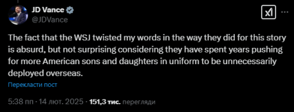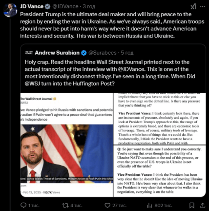 Накануне американское издание The Wall Street Journal опубликовало материал, в котором утверждалось, что Вашингтон готов применить жесткие меры против Москвы – от санкций до возможного развертывания американских войск в Украине. Заявление якобы сделал именно вице-президент Вэнс в контексте переговоров США с Россией по завершению войны.