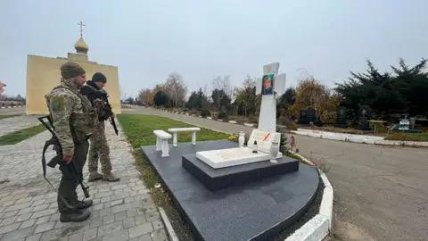 Затем Гандзюк установили белый памятник в виде креста с нагробными плитами белого и серого цветов. На крест прицепили цветной портрет активистки. Также на месте захоронения можно увидеть скамейки, вазы для цветов и подсвечники.