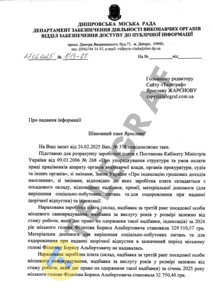 Об этом говорится в ответе Днепровского городского совета на запрос "Телеграфа". В документе указано, что материальная помощь для решения социально-бытовых вопросов и для оздоровления при предоставлении ежегодного отпуска Филатову не предоставлялась.