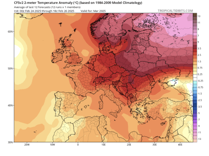 На карте представлена прогностическая информация о распределении аномалий температуры воздуха (не путать с фактической температурой) на территории Европы в марте 2025 года.