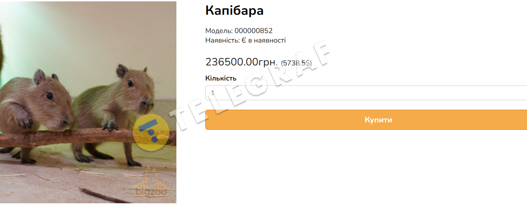 Купить себе это очень популярное животное можно и в Украине. Цена на капибару немалая – 236 500 грн, что эквивалентно более 5 700 долларов США. И это не единственные затраты, ведь для капибары нужно устроить хорошее место для проживания. В объявлении, кроме описания нужных условий, также указано происхождение животного: "Капибара нашего разведения".