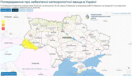 14 марта в результате прохождения южного циклона по всей территории страны усилится ветер, скорость которого достигнет 17-22 м/с. Это может привести к его разрывам и осложнениям в транспортном движении. Также синоптики прогнозируют 1 уровень опасности (желтый) несколько раньше – 12 марта.